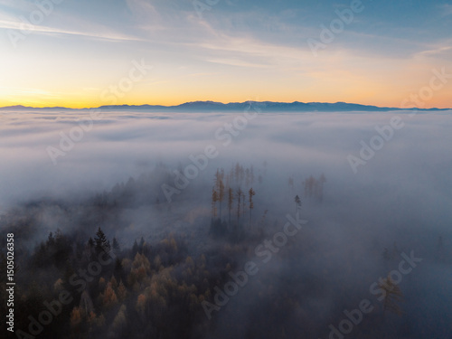 © Zedspider, Fototapeta premium Misty morning in Liptov region with High Tatras mountains around. Liptovsky Mikulas landspace, slovakia.