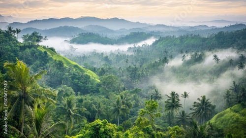 © Heruu, Obraz premium Misty morning in lush green tropical mountain valley.