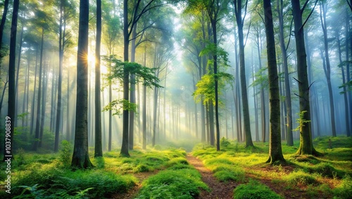 Obraz premium Misty morning in the forest with fog creating a surreal forced perspective
