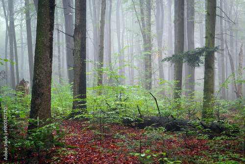 © Piotr Krzeslak, Fototapeta premium Misty morning in the green forest