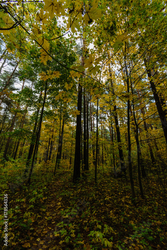 © Martins Vanags, Naklejka premium Misty morning in the woods. forest with tree trunks