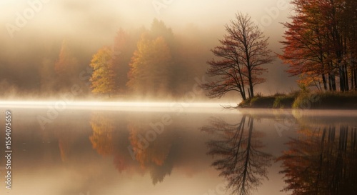 © Rimi, Naklejka premium Misty Morning Lake Reflection Autumn Trees Golden Hour Light