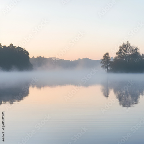 Fototapeta premium Misty Morning Lake Reflection: Serene landscape, tranquil lake reflects soft...