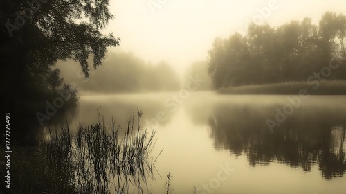 Fototapeta premium Misty Morning Lake Reflections Serene Treescape