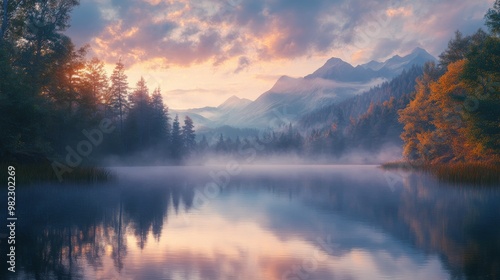 © addymawy, Fototapeta premium Misty Morning Lake Surrounded by Trees and Mountains with a Pink Sky
