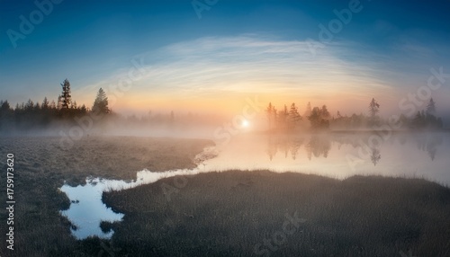 © Elsy’s Calm Gallery, Fototapeta premium Misty Morning Lake with Sunlight Streaming Through Fog