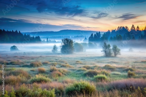 Fototapeta premium Misty morning landscape over a serene meadow.