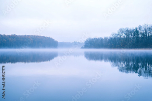 © Aoey, Fototapeta premium Misty Morning Landscape Over Calm Water with Reflections