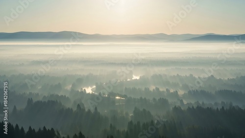 © Eitu Project, Naklejka premium Misty Morning Landscape with Foggy Valley and Distant Mountains at Sunrise.