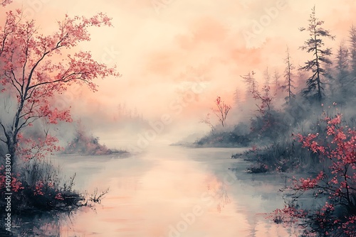 © Ibnu, Naklejka premium Misty morning landscape with pink trees and fog.