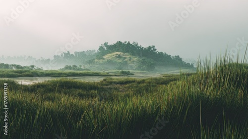 Obraz premium Misty morning landscape with tall grass and distant wooded hills