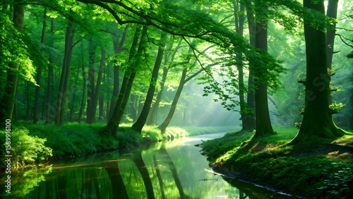 Fototapeta premium Misty morning light filters through green forest trees onto a winding path, a...