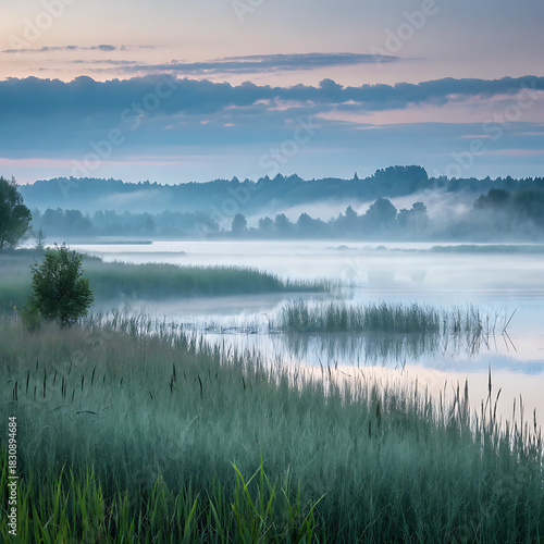 Fototapeta premium Misty morning natural landscape with calm lake, fog, and reeds.
