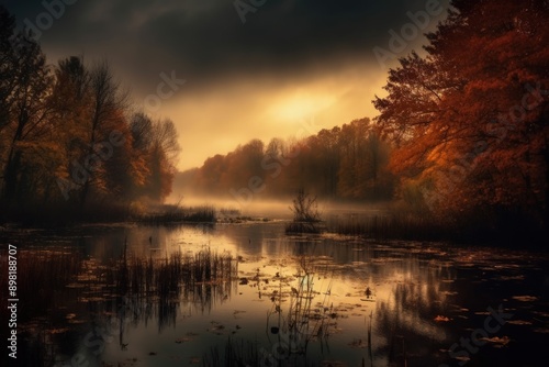 © Lazartivan, Obraz premium Misty Morning on Lake with Autumn Trees