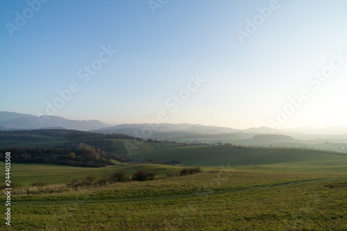 Obraz premium Misty morning on meadow with trees and views. Slovakia