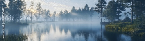 © Thi, Fototapeta premium Misty morning over a serene forest lake reflecting the rising sun.
