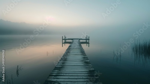Fototapeta premium Misty Morning Over Calm Water With Wooden Dock Reflecting Soft Light