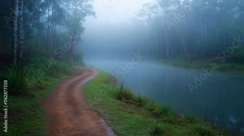 © BerkahStock, Obraz premium Misty morning path winding along a tranquil lake, lush greenery, fog.