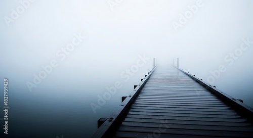 © Ulum, Fototapeta premium Misty Morning Pier Extending into Foggy Lake.