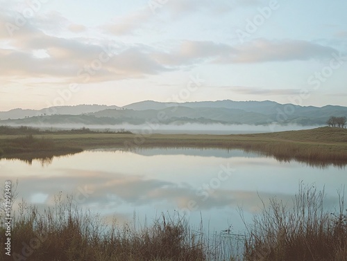© Nontawat, Fototapeta premium Misty morning reflection on calm lake early march nature photography tranquil environment serene viewpoint