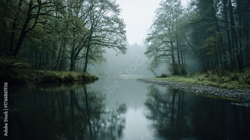 Fototapeta premium Misty morning reflection serene forest river nature scene tranquil...