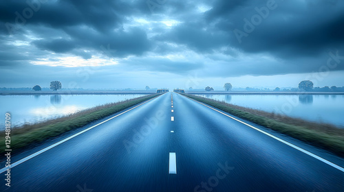 Fototapeta premium Misty Morning Road Through Flooded Fields