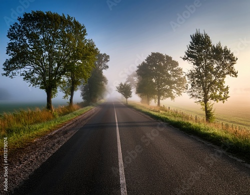 Fototapeta premium Misty morning rural road with lush trees and sunlight