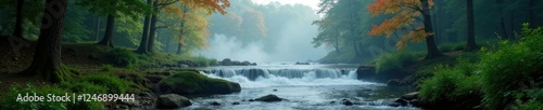 © AiGallery, Fototapeta premium Misty morning scene with Shohola Creek waterfall, forests, mist