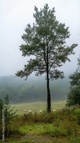 Obraz premium Misty morning, sheep grazing, tree, field. Pastoral scene, nature background