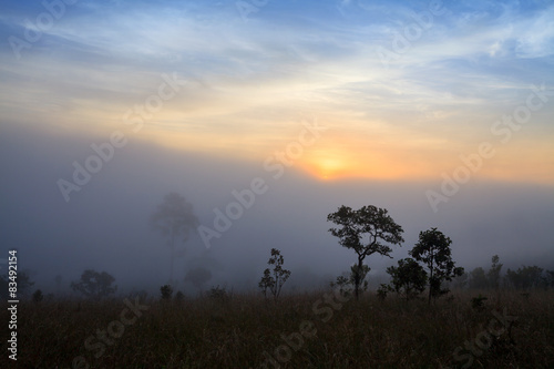 Obraz premium misty morning sunrise in mountain at Thung Salang Luang National