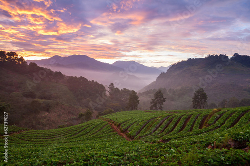 © sripfoto, Fototapeta premium misty morning sunrise in strawberry garden