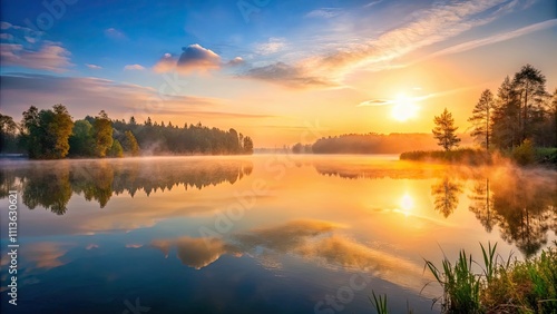 Fototapeta premium Misty morning sunrise over a tranquil lake , mist, morning, sunrise,...