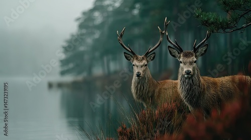 Naklejka premium Misty morning with deer in nature reserve tranquil landscape serene...