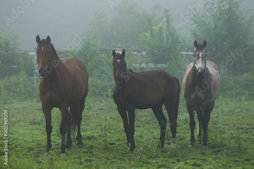 Obraz premium Misty morning with horses grazing on green pasture.