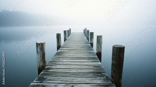 © bat max, Obraz premium Misty morning wooden dock leading to horizon