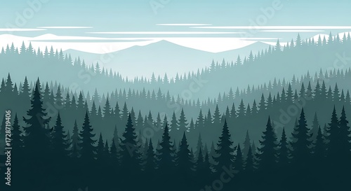 Obraz premium Misty Mountain Forest Landscape with Evergreen Trees.