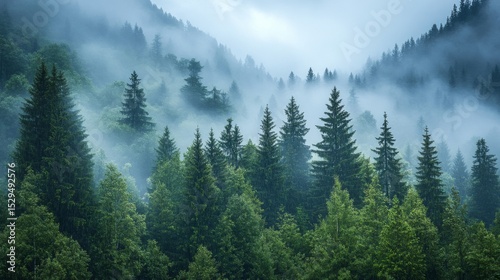 © Lintan, Obraz premium Misty Mountain Forest Landscape with Lush Green Trees