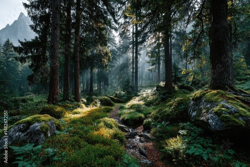 © Aini, Obraz premium Misty mountain forest path. Sunlight filters through tall trees