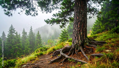 Obraz premium Misty mountain forest with large pine tree