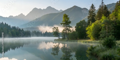 © KhWutthiphong, Naklejka premium Misty Mountain Lake at Sunrise