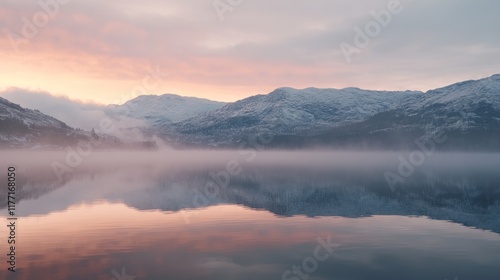 Fototapeta premium Misty Mountain Lake at Sunrise: A Serene Winter Landscape