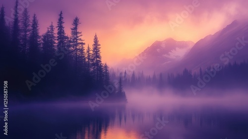 © DigitalDruid, Fototapeta premium Misty mountain lake at sunrise with blurred trees in foreground showcasing serene purple and orange hues in tranquil landscape scene