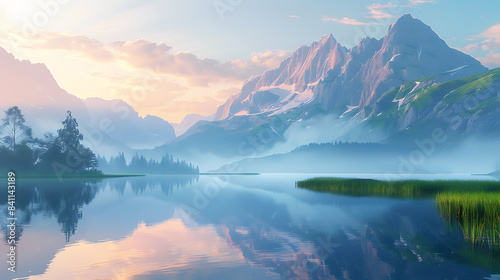 © Id, Fototapeta premium Misty Mountain Lake at Sunrise with Reflections