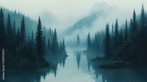 © Lesuna, Fototapeta premium Misty Mountain Lake Forest
