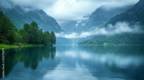 © Azis Stock, Naklejka premium Misty mountain lake, serene landscape, calm water, reflection, travel postcard
