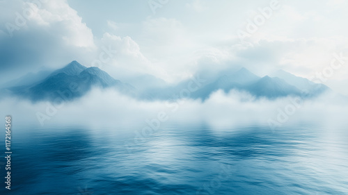 Fototapeta premium Misty Mountain Lake: Serene landscape photography of a tranquil lake shrouded in mist, with majestic mountains rising in the background. The image evokes a sense of calm and mystery.