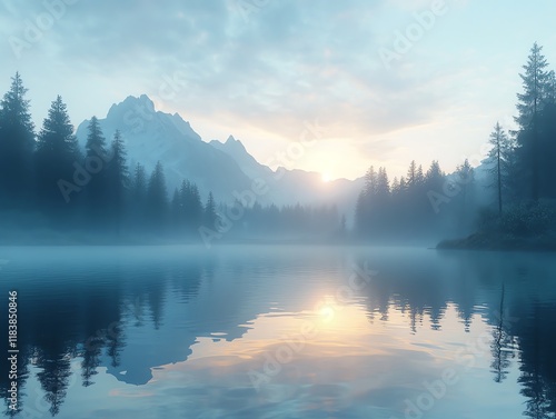 © nurion, Fototapeta premium Misty Mountain Lake: Serene Sunrise Landscape Painting