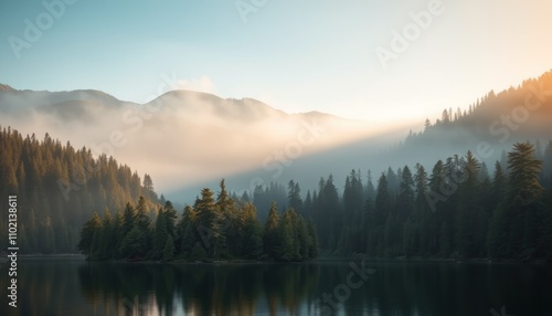 Fototapeta premium Misty mountain lake sunrise, tranquil morning light reflecting on still water, dense forest, serene landscape.