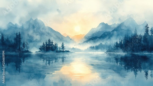 Fototapeta premium Misty Mountain Lake Sunrise Watercolor Painting