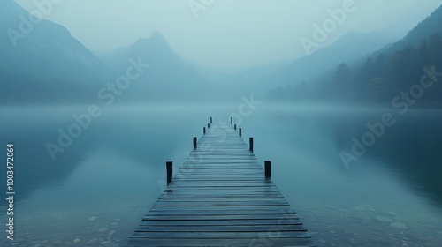 Fototapeta premium Misty Mountain Lake with Wooden Dock